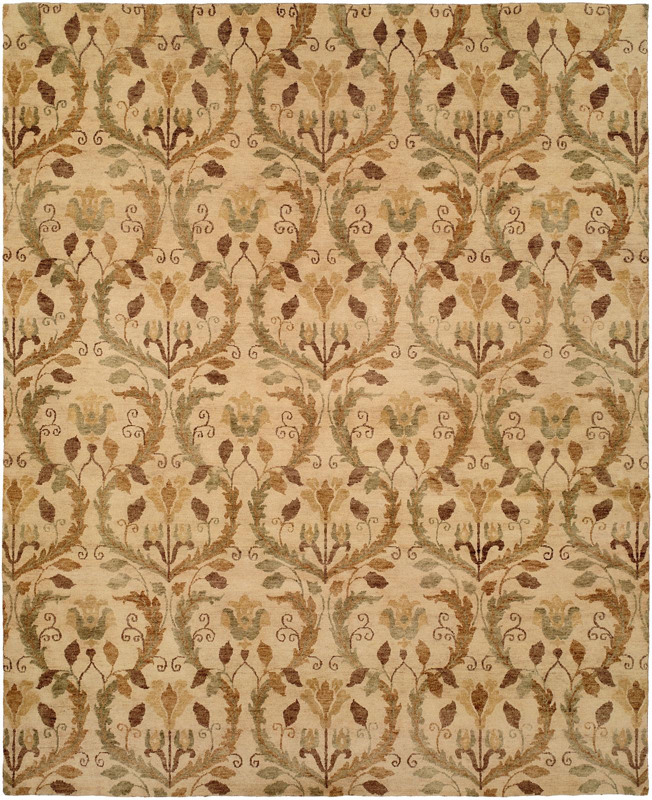 Simple floral and leaf motifs, woven from premium 100% hand-spun wool, which give the desired striations in color for today?s all-important vintage look. Designed without fringe for a clean, contemporary twist on a traditional, low-pile Nepal-weave rug.